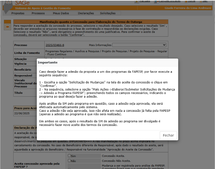 2 – Adesão em Fluxo Contínuo – neste caso, a adesão poderá ser solicitada dentro sistema SAGe por meio de uma Solicitação de Mudança (SM) na etapa de aceite da concessão, aplicando-se às modalidades Auxílio à Pesquisa Regular (APR), Projeto Temático e Jovem Pesquisador.